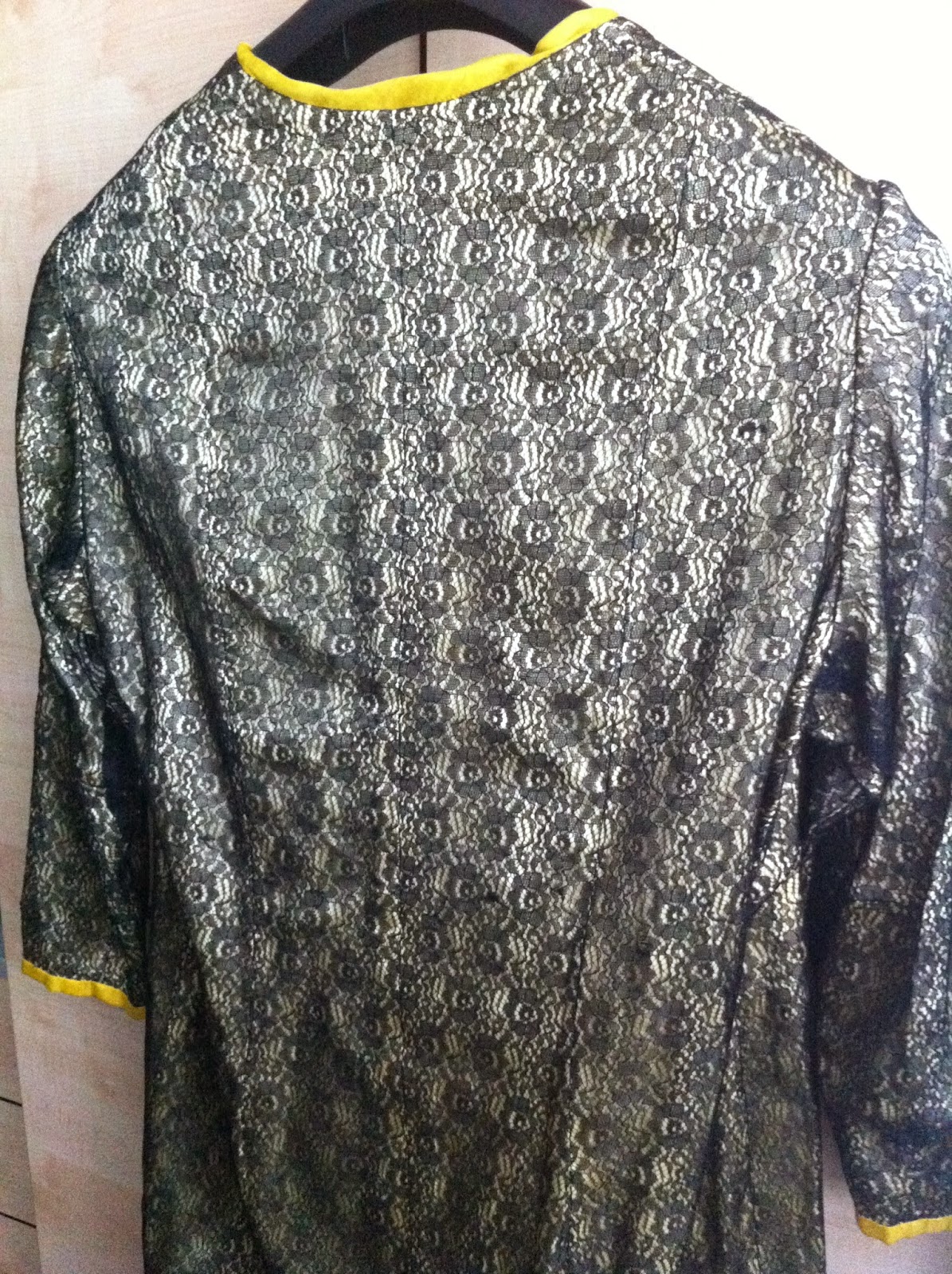 marime 44 , foarte comoda , lungime 109 cm , dantela e pe fundal galbui , se poate purta cu acel guler tip esarfa ,sau se poate baga inauntru , rochia e foarte eleganta ,